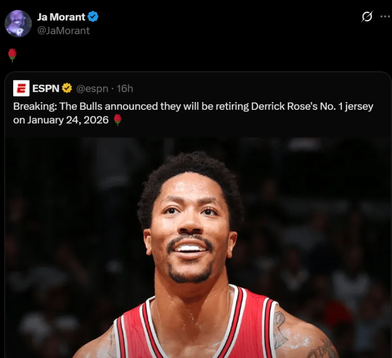 虎扑08月22日讯 今日,ESPN官方更新动态,宣布公牛将在2026年1月26日正式退役德里克-罗斯的1号球衣。